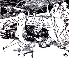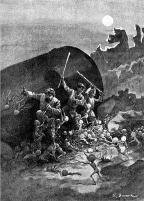 they are attacked by savage dwarf-like beings with long, tentacled arms.