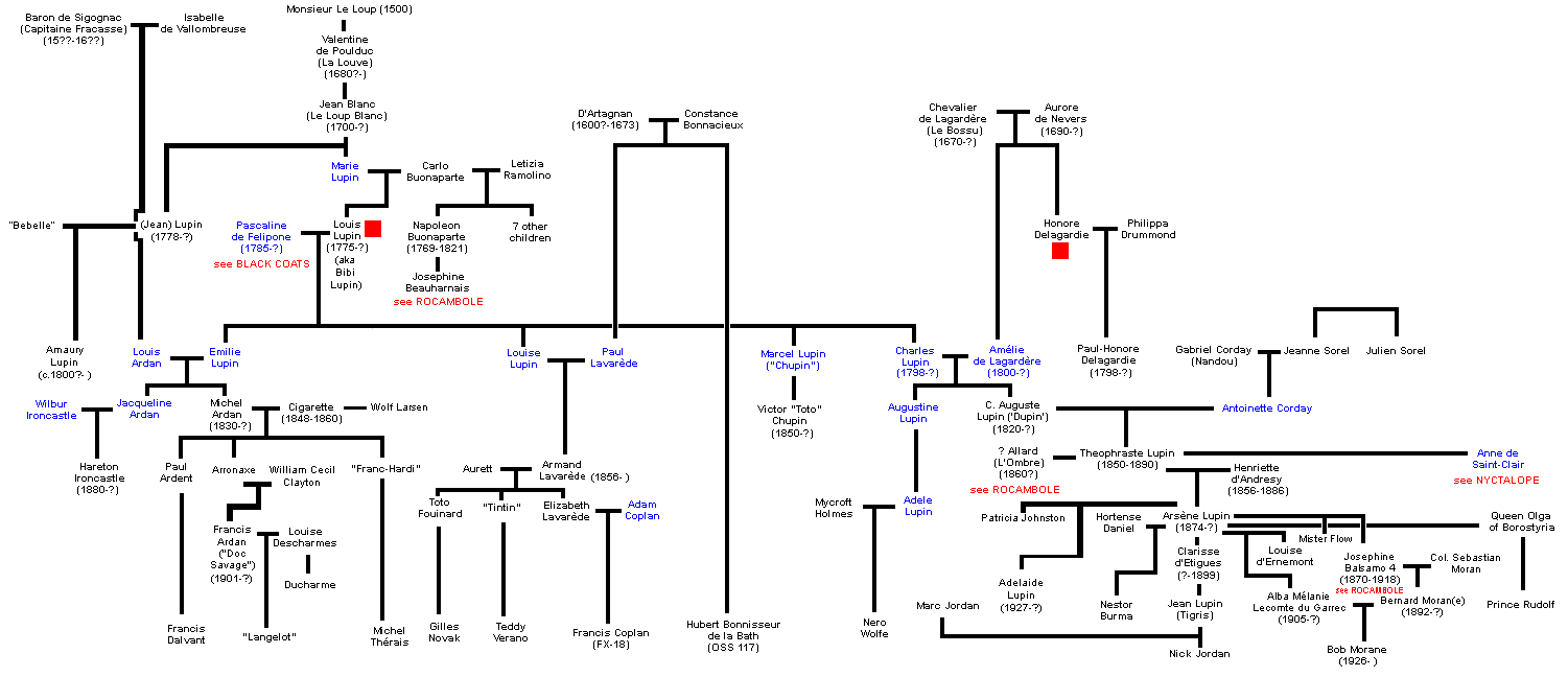 - In the mid-1880s, Theophraste Lupin, while working for Jean Roussel-Ballmeyer (see Lecoq family tree) in the United States (Ballmeyer's career was chronicled by Gaston Leroux in his Rouletabille novels), had an affair with Anne de Saint-Clair(who was using the spelling of Sainclair in America), the daughter of Roland de Clare, a.k.a. Coeur d'Acier and Nita d'Eppstein (whose lives were recounted by Paul Féval in Les Habits Noirs. Theophraste and Anne had one child, a boy named Jean Leo Sainclair, who grew up to become the crime-fighter known as the Nyctalope, whose adventures were chronicled by Jean de La Hire, and whose family tree is examined in detail in another document (see The Nyctalope family tree).